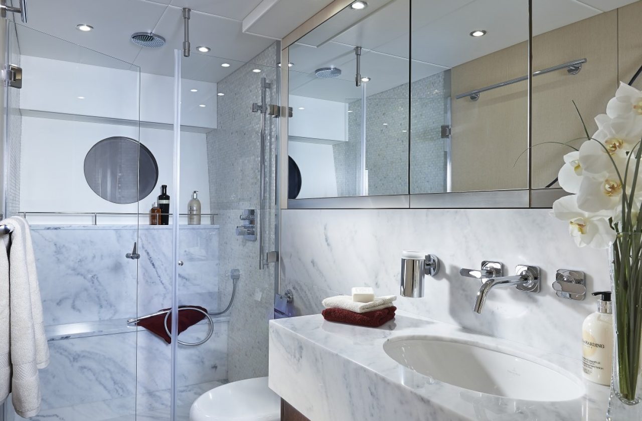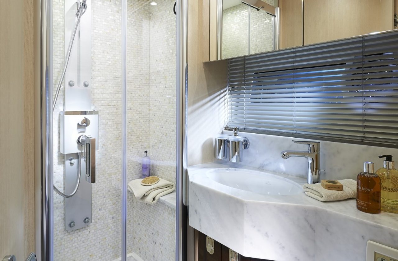On the main deck, expansive windows allow plenty of natural light to illuminate both the dining and separate seating areas. Below deck, three double suites, plus twin bed guest cabin comfortably accommodate up to eight guests.